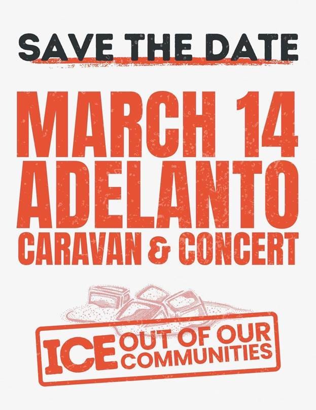 Also save the date (March 14) for a rally which will feature a festive picnic and concert at private prison company GeoGroup’s Adelanto Detention Center north of Victorville. GeoGroup, a major funder of Trump’s campaign, has a sweetheart no-bid contract to operate the immigrant detention center for the Department of Homeland Security. Congressional representatives who toured the facility after ICE raids started in Los Angeles last June, including Rep. Judy Chu, found horrible conditions there. They included lack of access to drinking water and medical care, as well as lack of access to phones to call for legal assistance or to reach family members. Look for future communications and details about the rally being planned outside the detention center and look for a blog post on our website soon on the bigger picture of GeoGroup and private immigrant detention centers in America.