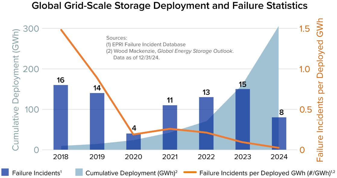 Below is data from the Electric Power Research Institute on the number of utility-scale battery backup failure incidents that have occurred in recent years. These failures involve fires and explosions.
