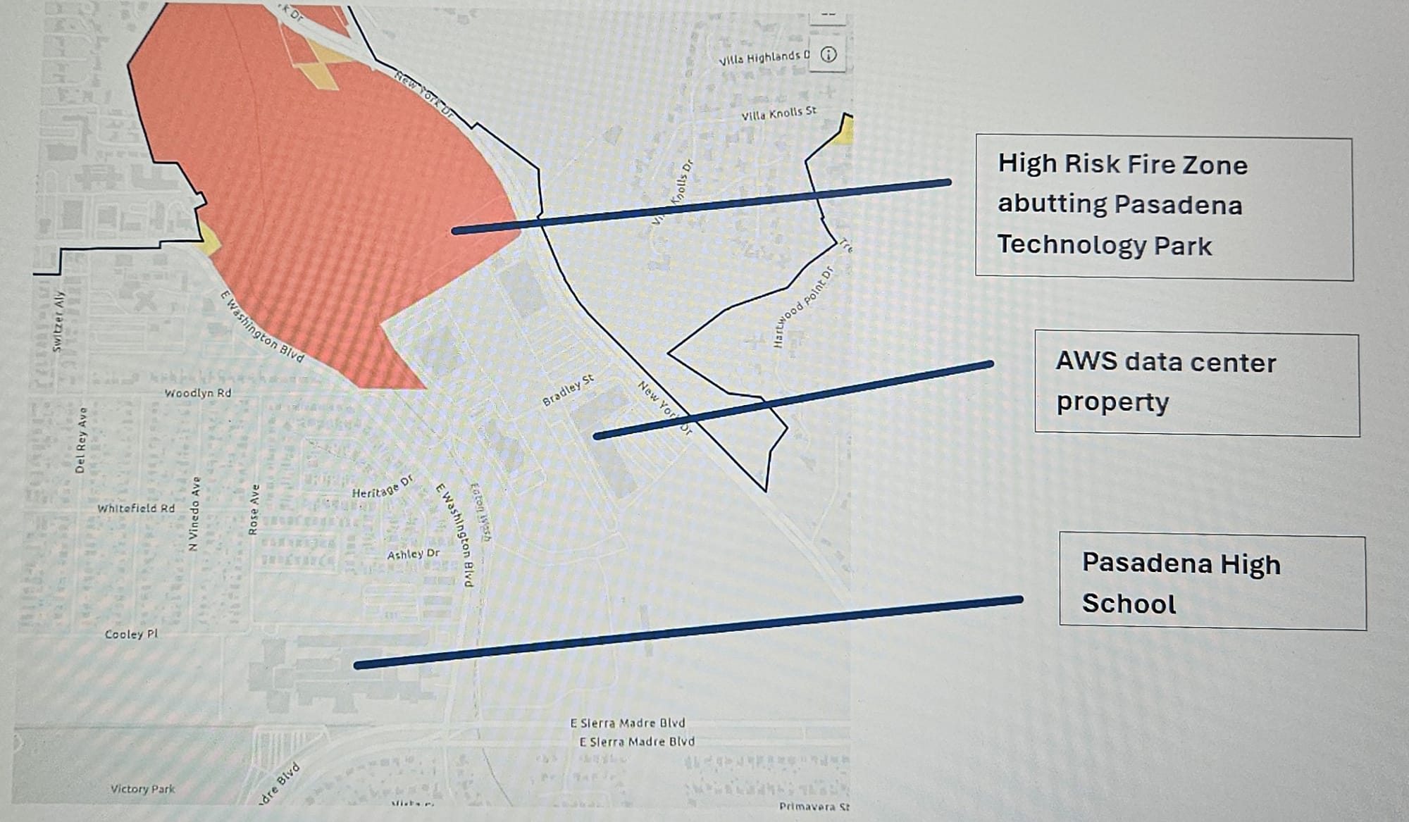 Amazon Web Services recently purchased a property in the Pasadena Tech Center at 2964 Bradley Street to ostensibly create a quantum data center (https://www.costar.com/article/1307131548/amazon-buys-property-in-los-angeles-as-it-broadens-us-data-center-strategy). The facility, which will likely contain chips, wiring, cryogenic cooling equipment and gases, and could include a large battery backup power supply system, could contain tons of toxic metals and plastics. The Tech Center immediately abuts a Very High-Risk Fire Zone that ends behind one of the buildings in the center and runs up the Eaton Wash into Eaton Canyon (https://www.cityofpasadena.net/fire/fire-hazard-severity-zones/). The center, including the AWS-owned building, is immediately across the wash from Pasadena High School and the California Rose Court housing development. Eaton Canyon, the ignition point for the massive wildfire that burned down more than 9,000 structures in 2025, has a history of burning. A 1993 blaze in Eaton Canyon burned down over 100 homes (https://en.wikipedia.org/wiki/Eaton_Canyon). In 1979, a wildfire burned through Eaton Canyon and much of the surrounding area (https://www.ecnca.org/history-of-eaton-canyon/). If a data center in the Pasadena Tech Center were to burn in a wildfire (which generally occurs when winds blow out of the north to northeast), it would spread ash laden with toxic metals downwind to Pasadena High School and nearby homes.