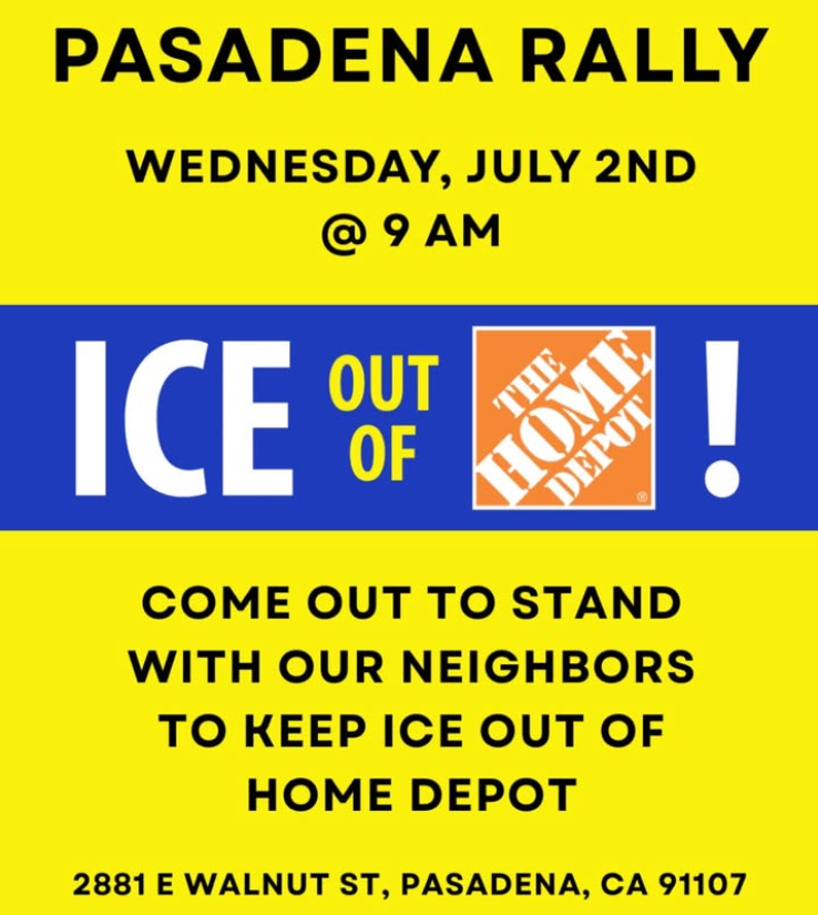 As you may have heard, National Day Laborer Organizing Network (NDLON) is asking the Pasadena & Altadena community for support as immigrant workers are under attack from ICE. Some of these raids have been taking place at Home Depot parking lots in Southern California where many day laborers go to find work. These are the same workers that visibly stepped up to help the community after the devastating January fires. At this time, NDLON are asking individuals and groups - anyone that might be a customer of Home Depot - to ask the company to protect immigrant workers at their stores.